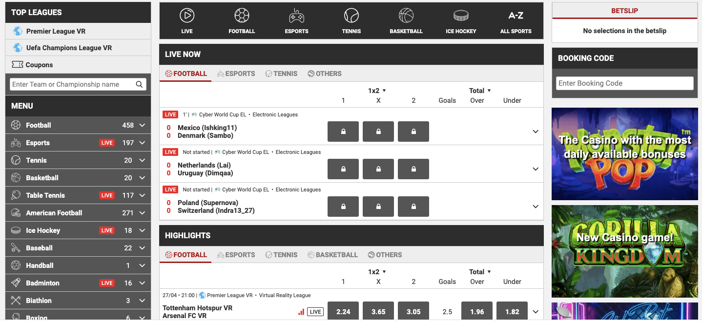 The sports are perfectly laid out down on the left hand side of this sportsbook homepage, with a logo accompanying every discipline. Some of the most popular events and live betting are found in the middle of the page, with bonuses and promotions and bonuses being on the right hand side of this sportsbook right hand side of the page.