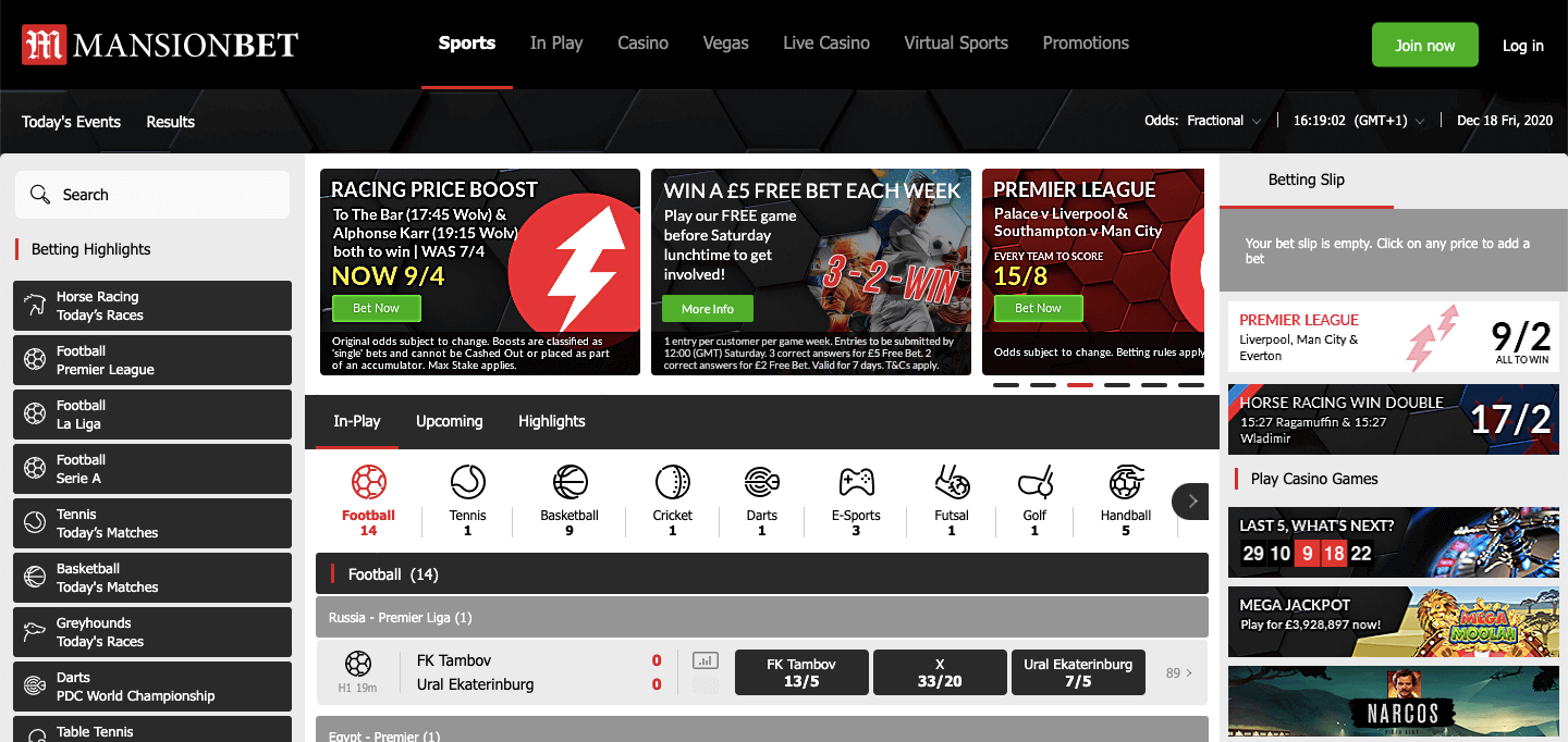 The top of the screen consists of a slider where you can find promotional offers, and immediately below it are in-play markets on offer. MansionBet makes everything easy for their players with their search function. With the search function, you can easily locate every sporting event that you want to wager.